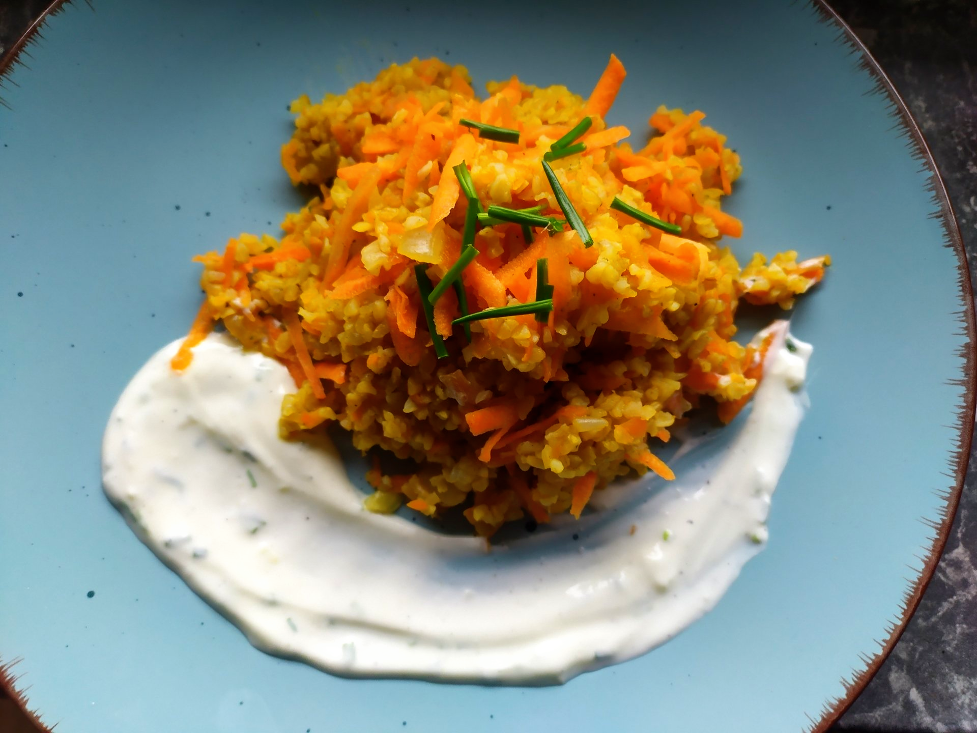 Karottenbulgur mit Joghurt-Knoblauch-Soße